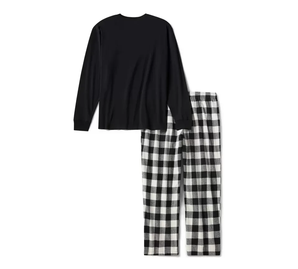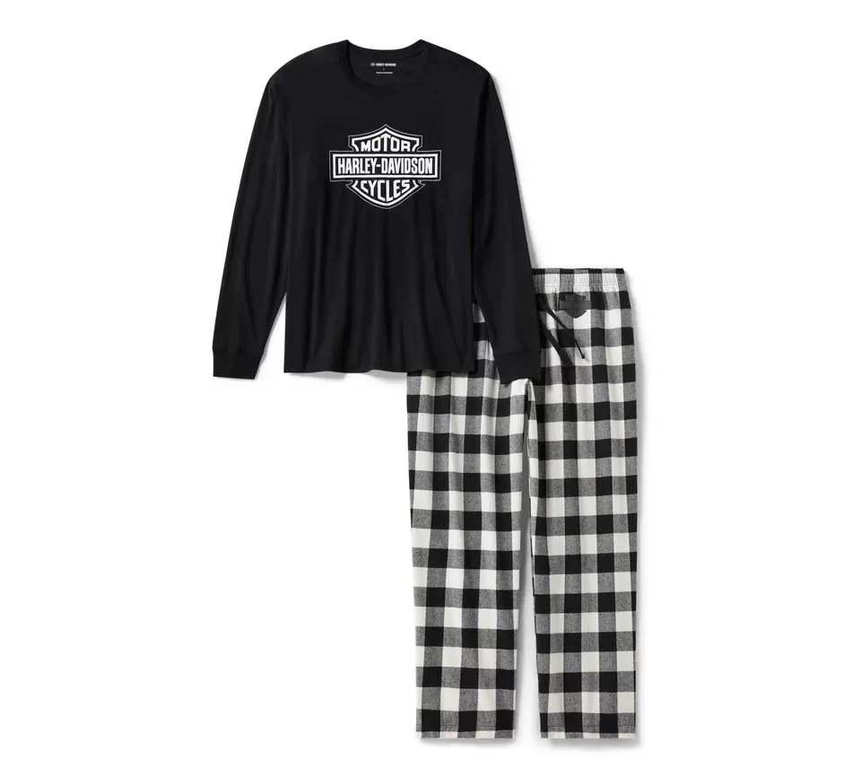 Dream of your next open-road adventure in our Bar & Shield Buffalo Check Pajama Set. The long sleeve top is made from super soft cotton/modal jersey, while the bottoms are an equally cozy cotton twill flannel. These men’s pajamas have a comfortable elastic drawstring waistband and rib knit trim on top to help keep its shape. This set is finished with our most iconic graphics grazing the bottoms and parked across the top.
