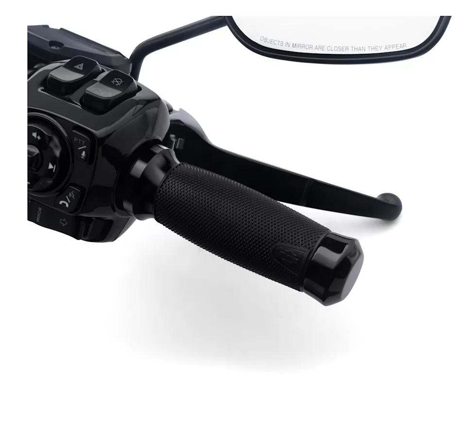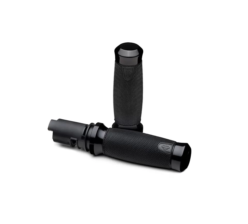 Dressed in tactified rubber for superior traction, these elegant hand grips provide a positive connection to the controls in wet or dry weather. The soft-touch cross-hatched rubber surface feels good against both gloved and bare skin, and the "thicker in the middle" profile forms a natural fit with your closed fist.