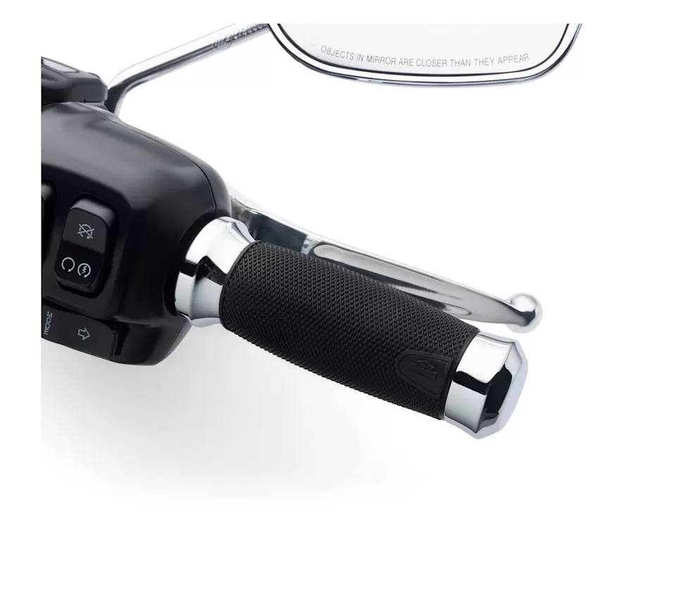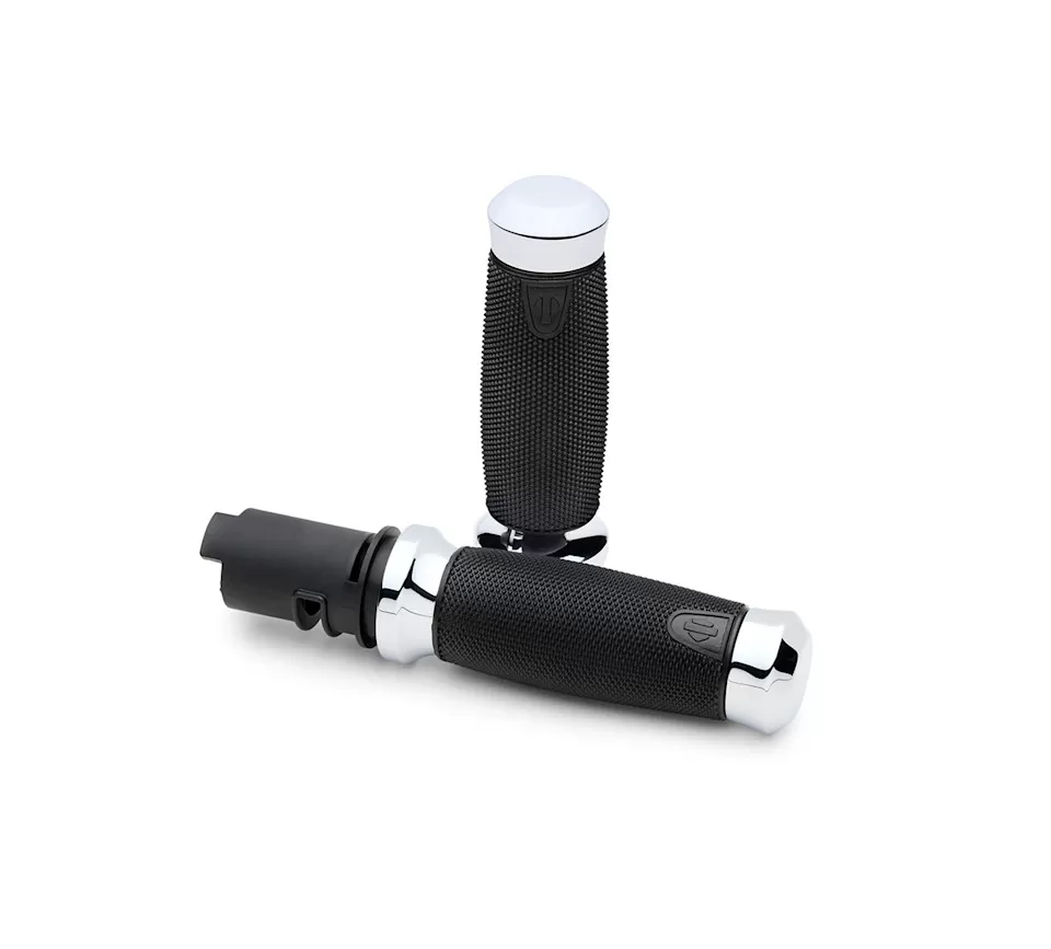 Dressed in tactified rubber for superior traction, these elegant hand grips provide a positive connection to the controls in wet or dry weather. The soft-touch cross-hatched rubber surface feels good against both gloved and bare skin, and the "thicker in the middle" profile forms a natural fit with your closed fist.