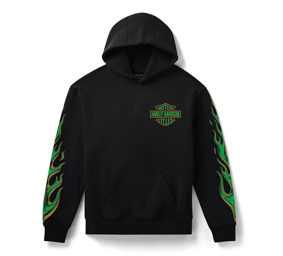 Irish luck shares a lane with moto pride on our limited-edition H-D® Skully McGee Pullover Fleece Hoodie. Its cozy cotton/poly fleece build in a relaxed fit features a jersey-lined drawstring hood and roomy kangaroo pocket. What makes this a standout seasonal style are the graphics parked on both sides and riding down the sleeves. In fact, even Skully McGee’s tooth shines in metallic ink (zoom in to see). Stay lucky—snag yours while supplies last.