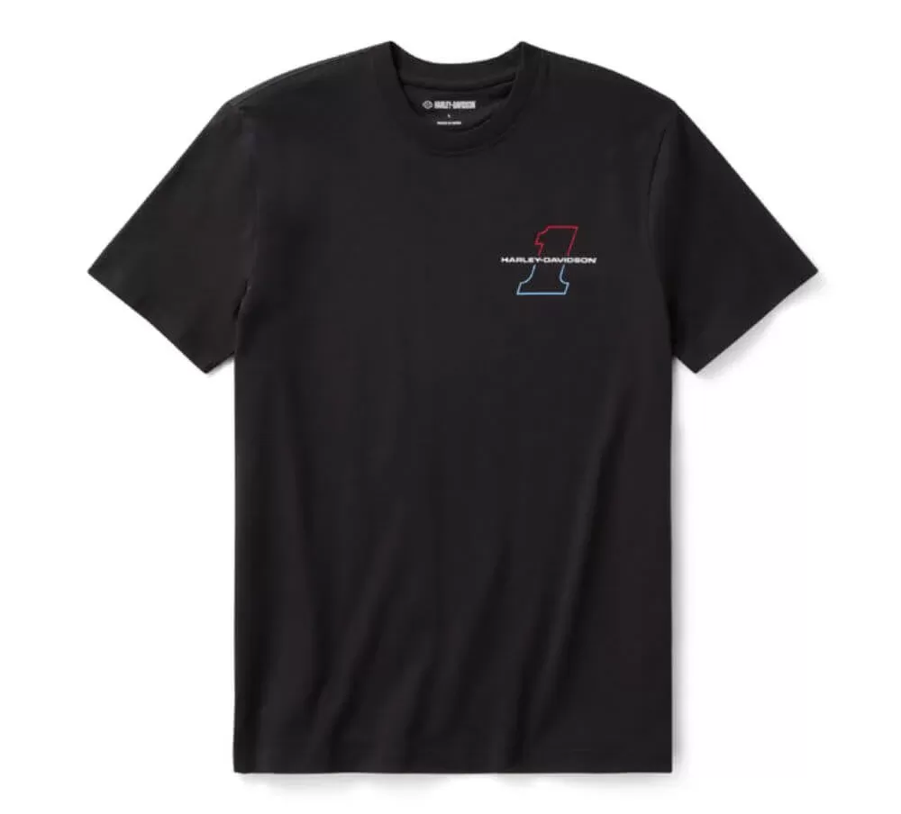 The front of the CVO Liberty Tee features a sleek, modernised #1 logo in classic red, white, and blue. This bold yet refined graphic pays tribute to Harley-Davidson’s legendary status while keeping the design fresh and contemporary. It’s a powerful nod to American heritage that instantly connects with long-time enthusiasts and new riders alike.