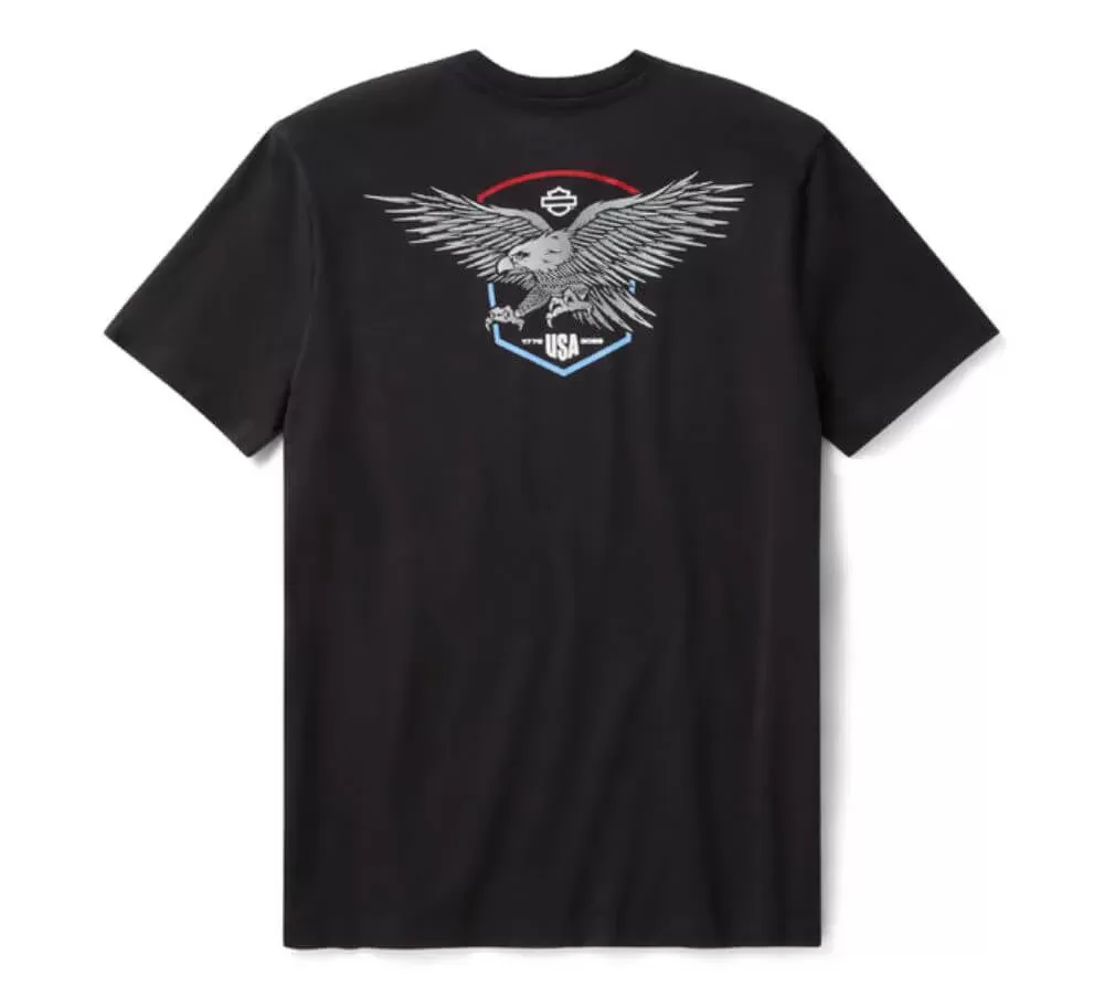 Turn it around to reveal a striking eagle graphic on the back, a timeless symbol of freedom, strength, and the open road. The detailed artwork reflects the core values of the Harley lifestyle, representing independence and the relentless pursuit of adventure. It adds visual impact without overpowering the overall design, keeping the tee stylish and versatile.