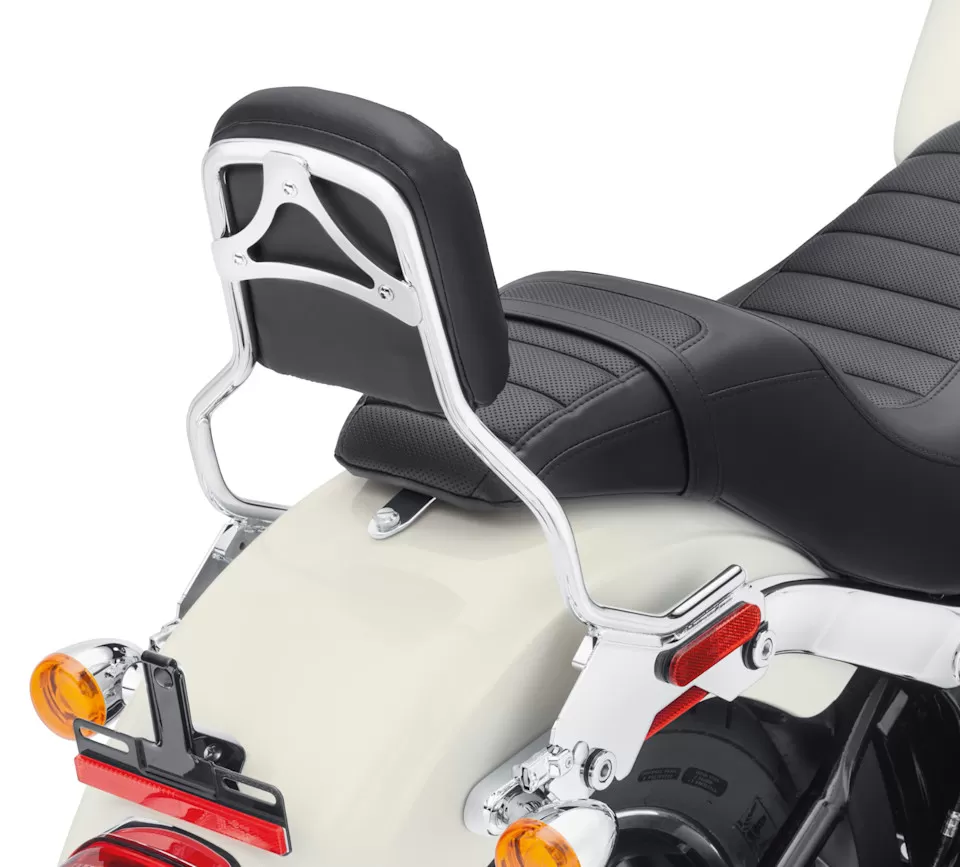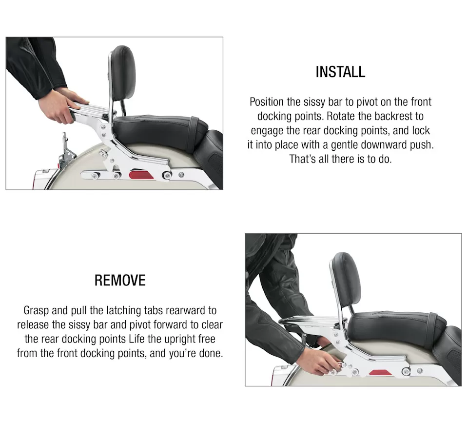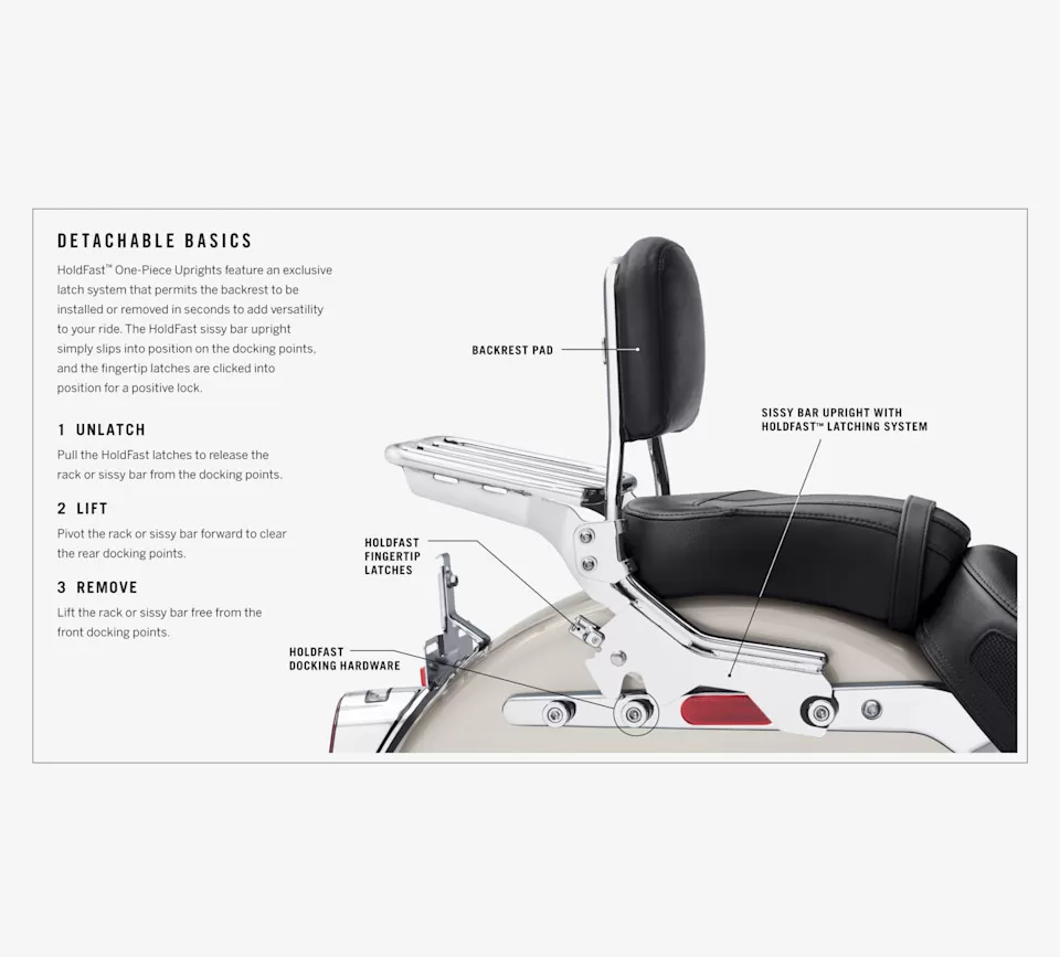 A sissy bar and passenger backrest pad is the starting point for building a complete touring machine. The backrest adds long-range comfort and support and provides a feeling of confidence and control for the passenger. HoldFast™ One-Piece Uprights feature an exclusive latch system that permits the backrest to be installed or removed in seconds to add versatility to your ride. The HoldFast sissy bar upright simply slips into position on the docking points, and the fingertip latches are clicked into position for a positive lock.