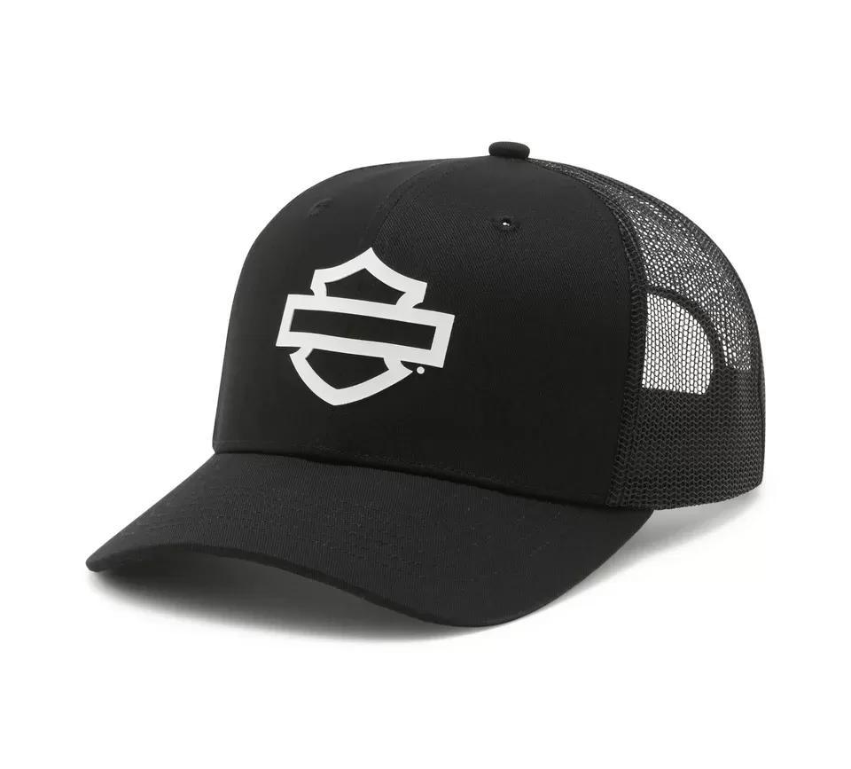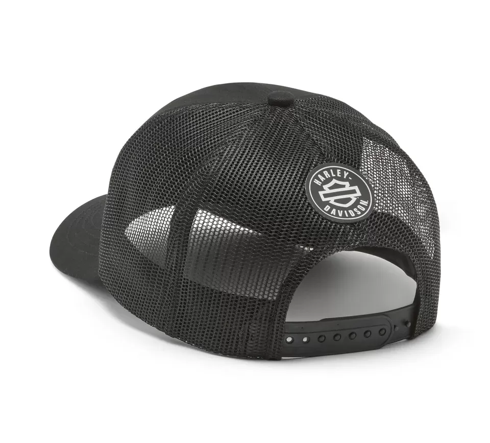 Go-with-anything style goes the distance in our Logo Switchback Trucker Cap. This men’s hat is built with an adjustable snap back for your ideal fit. True to its trucker silhouette, it features a mesh back panel for air-loving ventilation that keeps you cool. Finished with our open Bar & Shield on front and our branded patch on back.