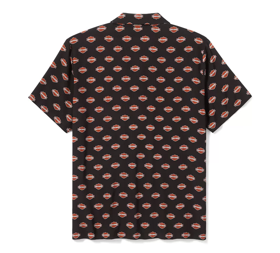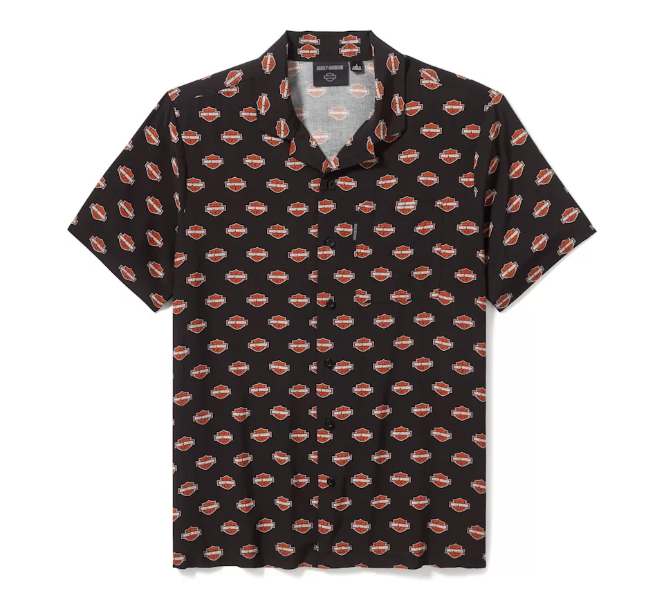 Allover moto style is all yours in the Bar & Shield Aloha Shirt. Made from rayon challis, a breathable and lightweight fabric that’s less wrinkle-prone than linen and ideal for keeping cooler in hot weather. Its relaxed fit features a patch chest pocket, camp collar, and side seam vents. This men’s short sleeve button down is finished with a custom repeat pattern of our most iconic logo.