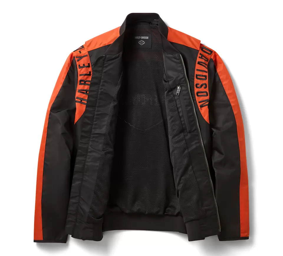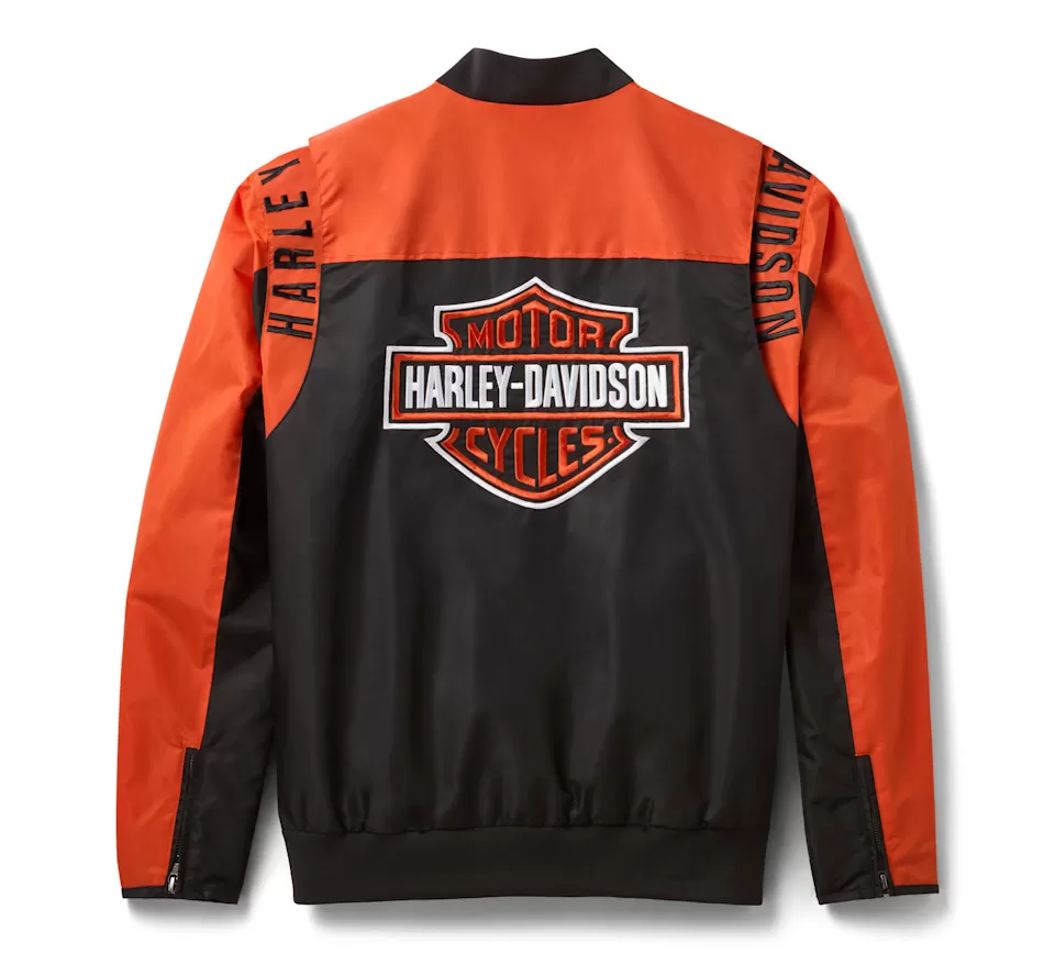 Standout style is all yours in our H-D® Mainstreet Nylon Bomber Jacket. It’s cut from rugged nylon twill with a water-resistant coating to help keep you dry in soggy weather. This men’s outerwear features zip-closed hand pockets for securing essentials plus rib knitting for added durability and stretch. Its vibrant colorblock look has our embroidered graphics making laps around the shoulders and our iconic Bar & Shield staking its claim on back.