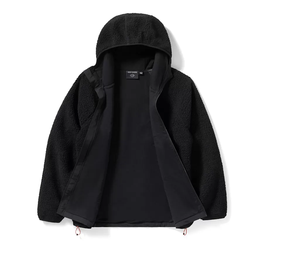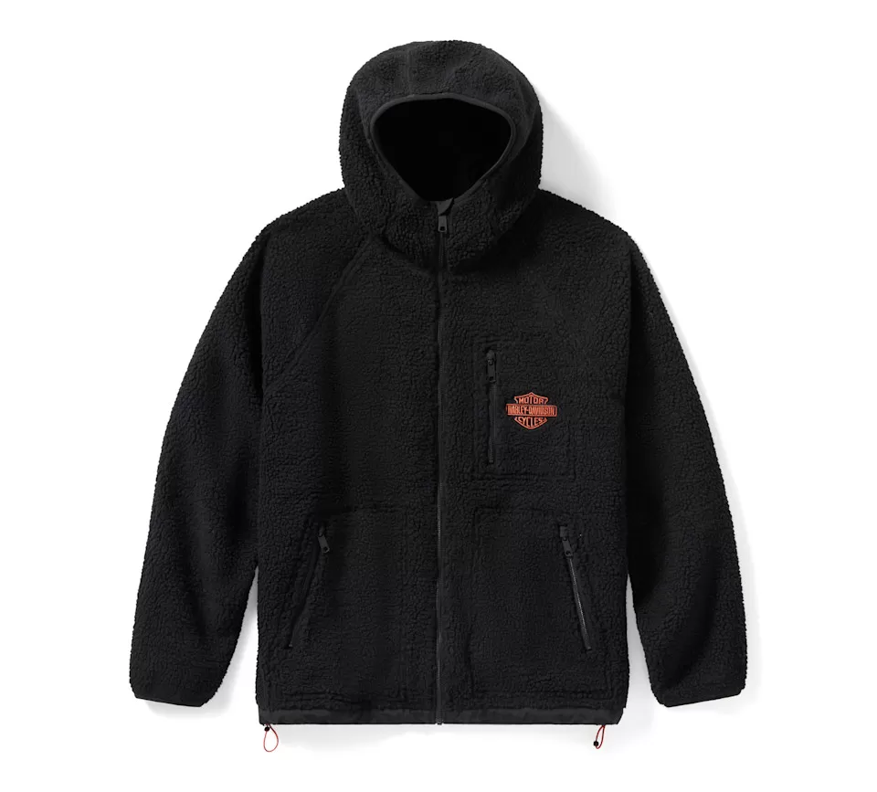 Stay cozy and committed to moto style in the Harley-Davidson® Sherpa Full Zip. It’s made from a fuzzy cut of heavyweight polyester Sherpa with an elastic bungee-cord hem, cuffs, and hood trim to help keep you warmer in chilly temps. This men’s outer layer features ample zip-closed pockets for securing essentials, plus contrast sleeve piecing for an elevated look. Minimally branded with an embroidered hit of our Bar & Shield on front.