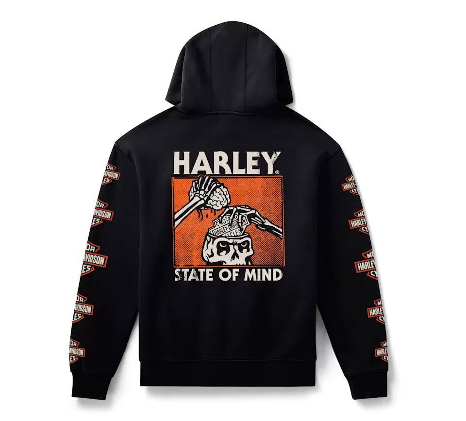 If the moto lifestyle is your therapy, the limited-edition H-D® State of Mind Pullover Fleece Hoodie is your new favorite. It’s made for cozy comfort from cotton/polyester fleece with hoodie must-haves like a roomy kangaroo pocket and jersey-lined drawstring hood. Custom graphics in a vintage-inspired, line art style are riding all over it for a one-of-a-kind look. Get yours while supplies last.