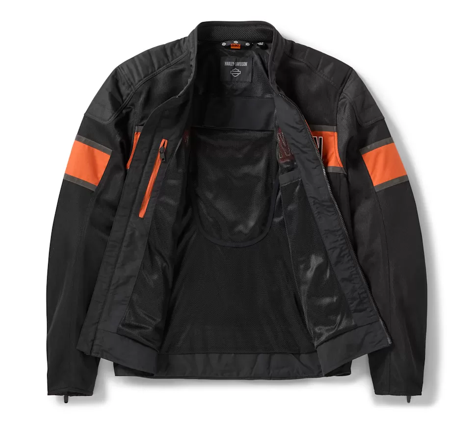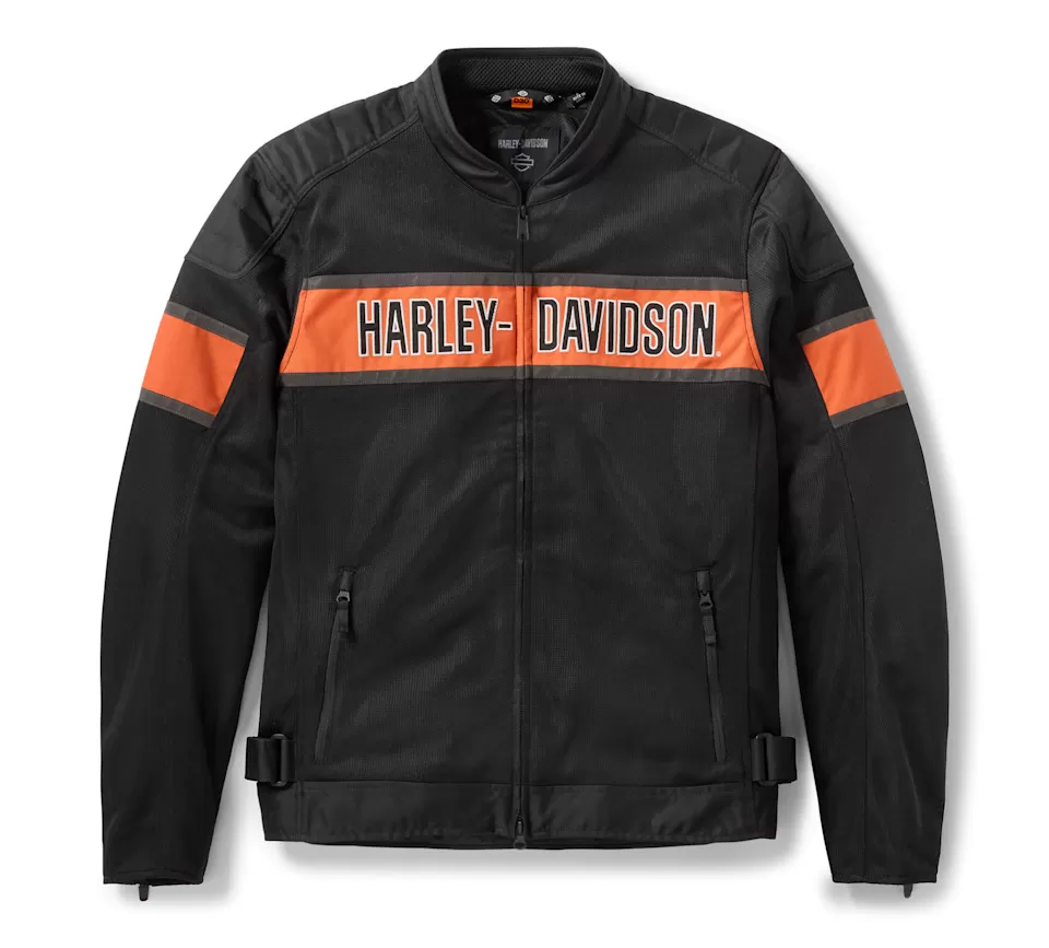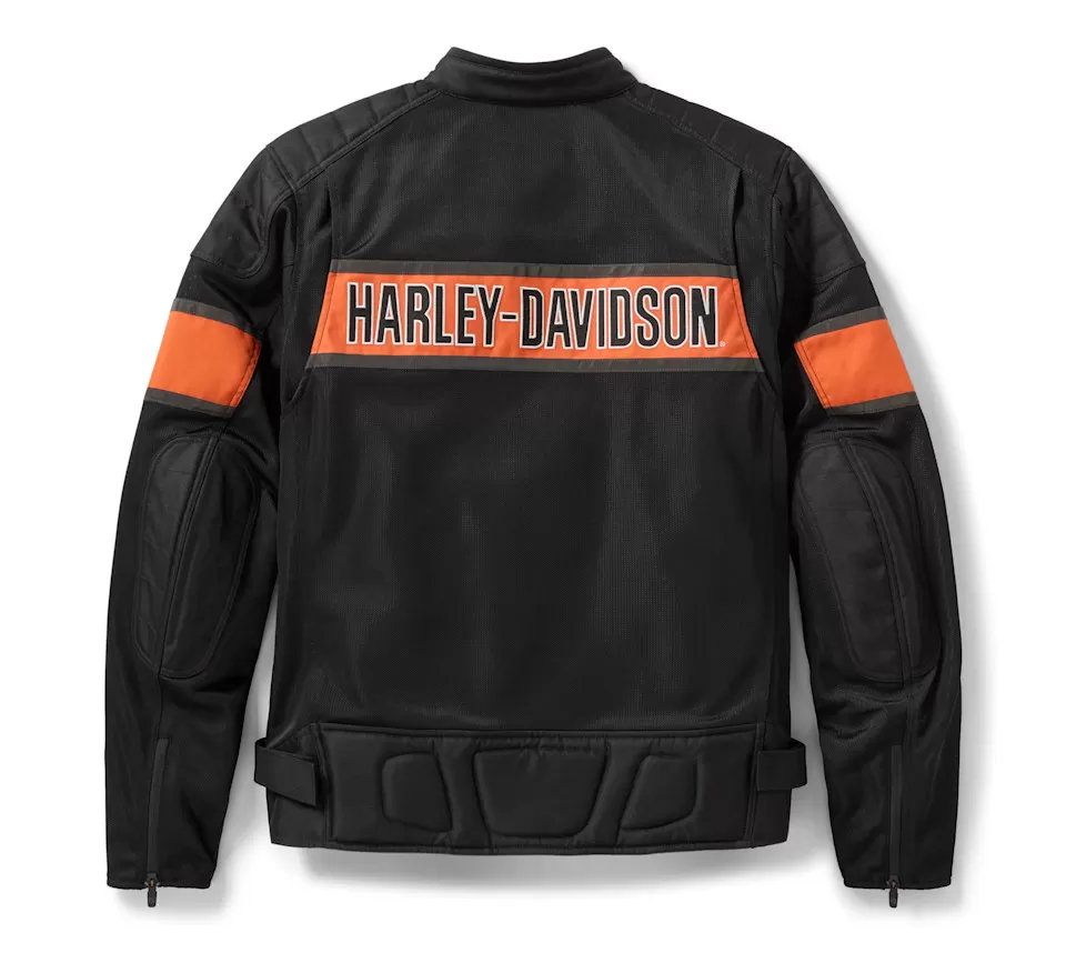 A best-seller made even better. That’s the best way to describe what our latest H-D® Trenton Mesh Riding Jacket is all about. We kept its air-loving, all-mesh construction, but upgraded it to include D3O® Ghost™ armor for lightweight impact protection, added more reflective material for enhanced visibility, and refreshed its style. This men’s motorcycle jacket is also tested and certified to meet abrasion, tear, and seam strength requirements. Its contrast colorblock design showcases embroidered appliqué graphics on both sides for a bold, contemporary H-D look.