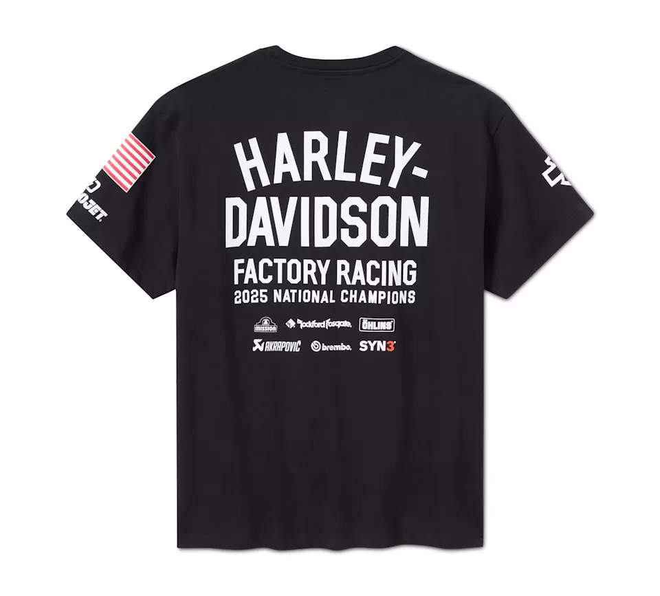 Commemorate several decades of our racing legacy on this special-issue H-D® Championship Tee. It’s made from a breathable, super soft cut of 100% cotton jersey in a relaxed fit with a rib-knit neckline to help keep its shape. This men’s t-shirt is proudly finished with a graphics medley that nods to the sponsors, products, accessories, and championship titles of our factory racing team. Know the history—the arched lettering on back mimics our 1937 racing apparel, while the #1 Logo on front debuted in 1969 to celebrate our AMA Grand National Championship season title. Snag yours while supplies last.