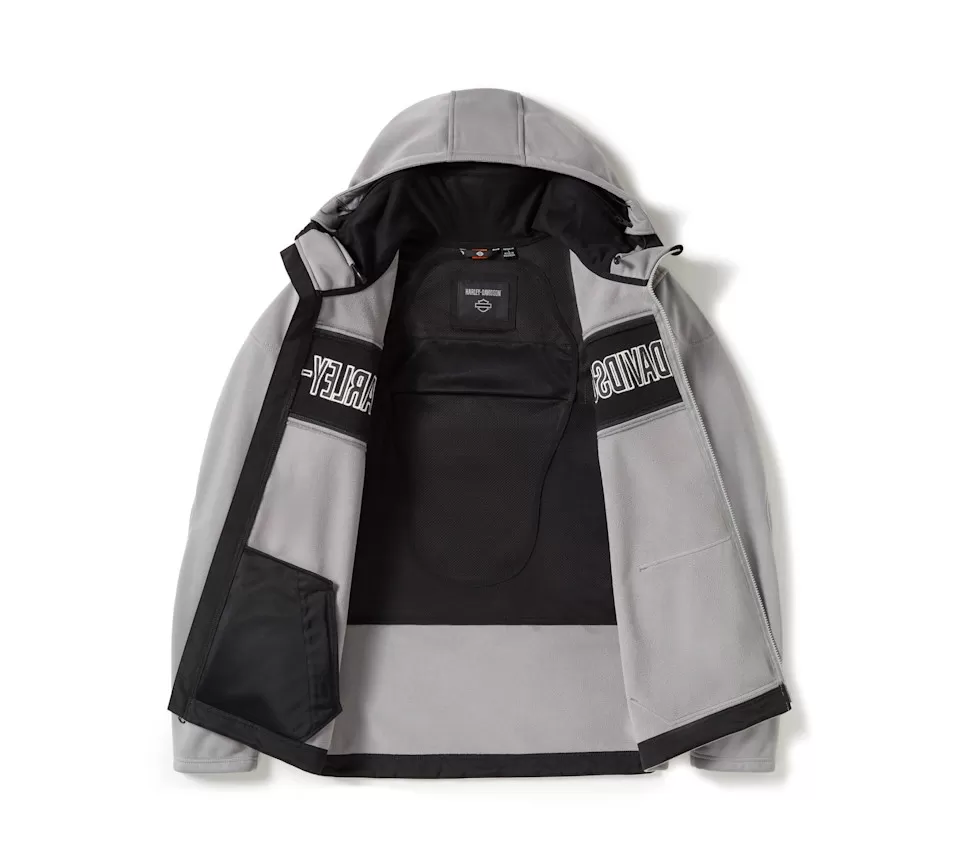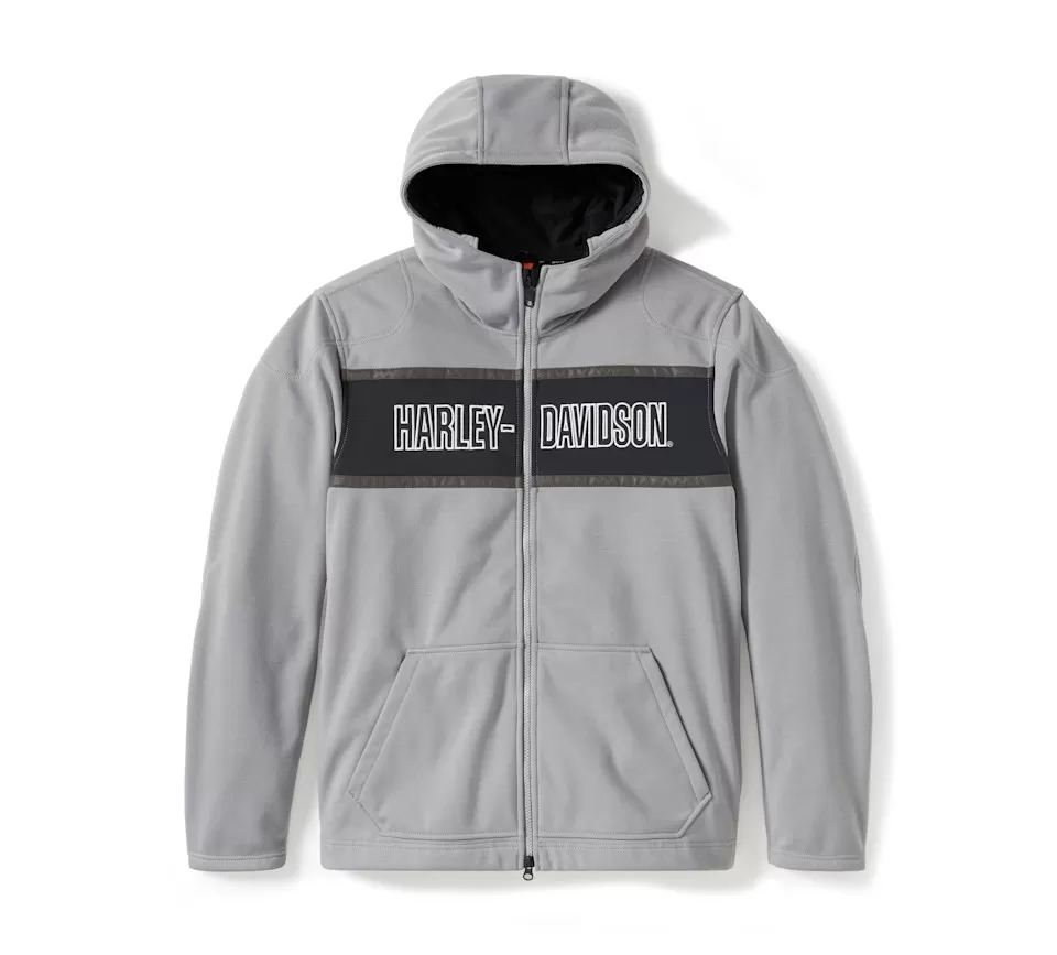 Enduring casual style merges with functional riding protection in our H-D® Trenton Deflector 2.0 Hooded Riding Fleece. This latest men’s motorcycle jacket is tested and certified to meet abrasion, tear, and seam strength requirements. It wisely includes impact protection with our D3O® Ghost™ armor at the shoulders and elbows. We’ve also extended the venting area to welcome more airflow, included reflective material to enhance visibility, and added a secure zippered pocket to the right kangaroo pocket. Made from a heavyweight bonded material with a breathable mesh lining, it’s engineered to be windproof and features an adjustable toggle-cord hood that zips down to reduce drag while riding. It’s finished with contrast piecing and our embroidered branding for a more modern, road-inspired look. See more of its specs below, then order yours while supplies last.