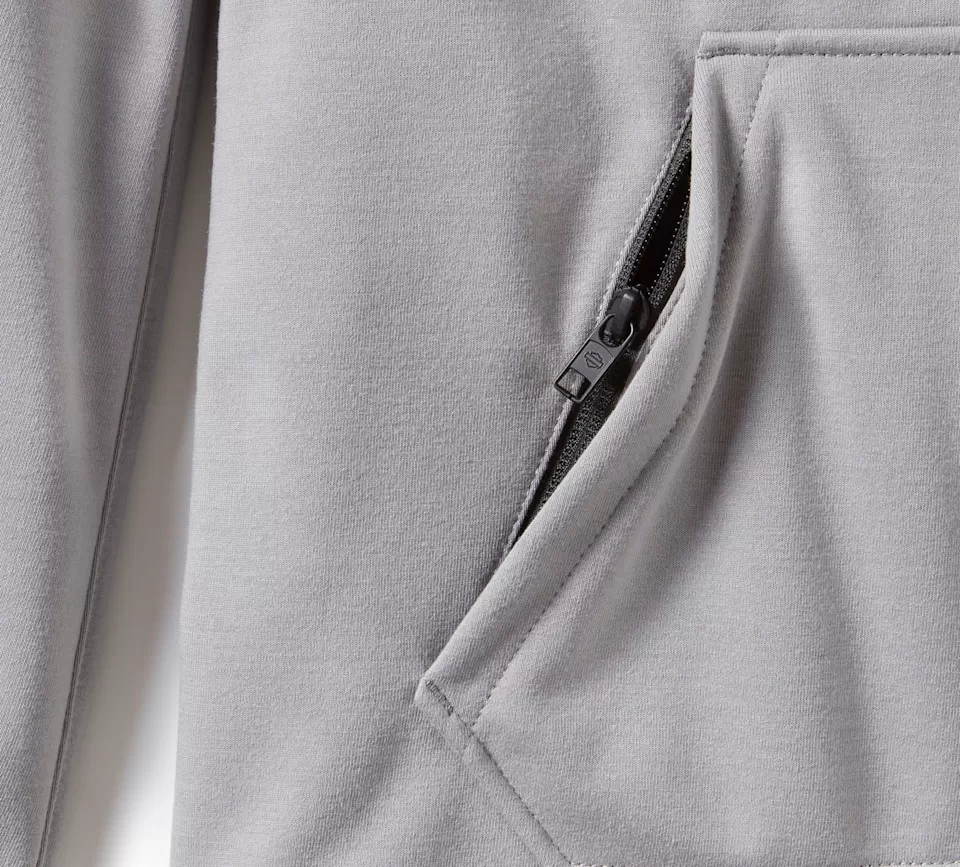 Pockets: Kangaroo-style, hand-warmer pockets with hidden zipper stash