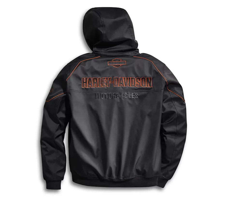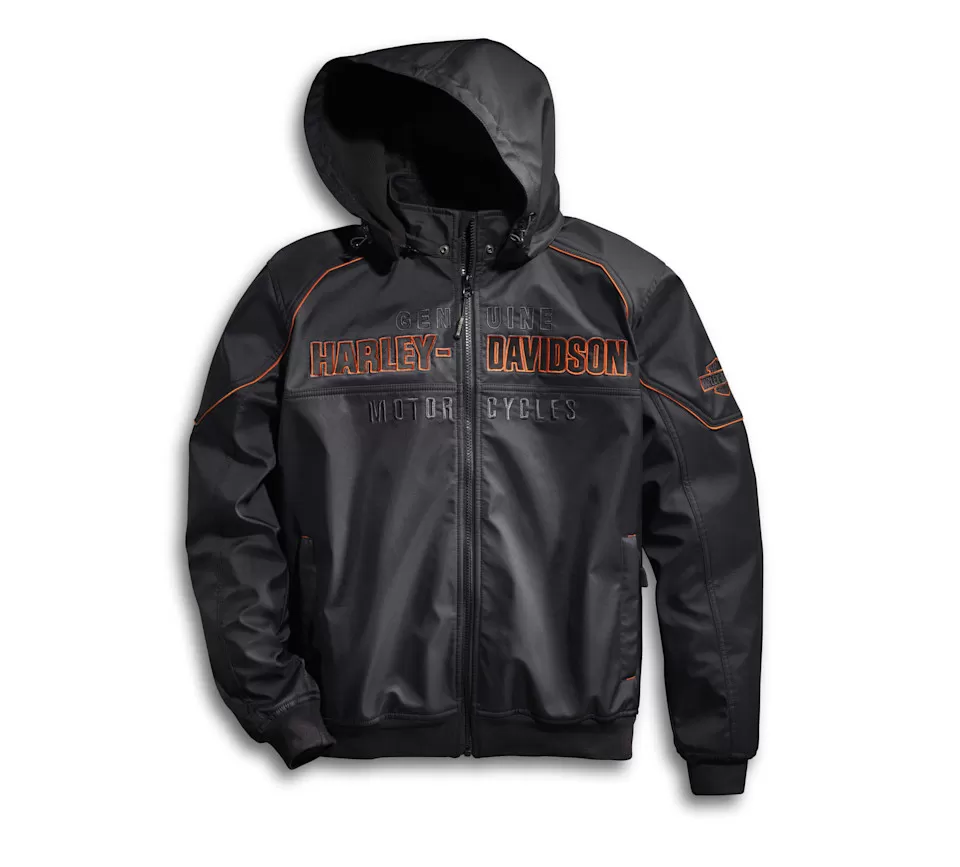 Biting winds? Bite back and ride in this functional soft shell jacket. Made from a durable cut of all polyester material with features like a removable cord-and-toggle hood and zippered hand-warmer pockets. Branded with an embroidered and appliqué mix that adds a pop of color and texture.