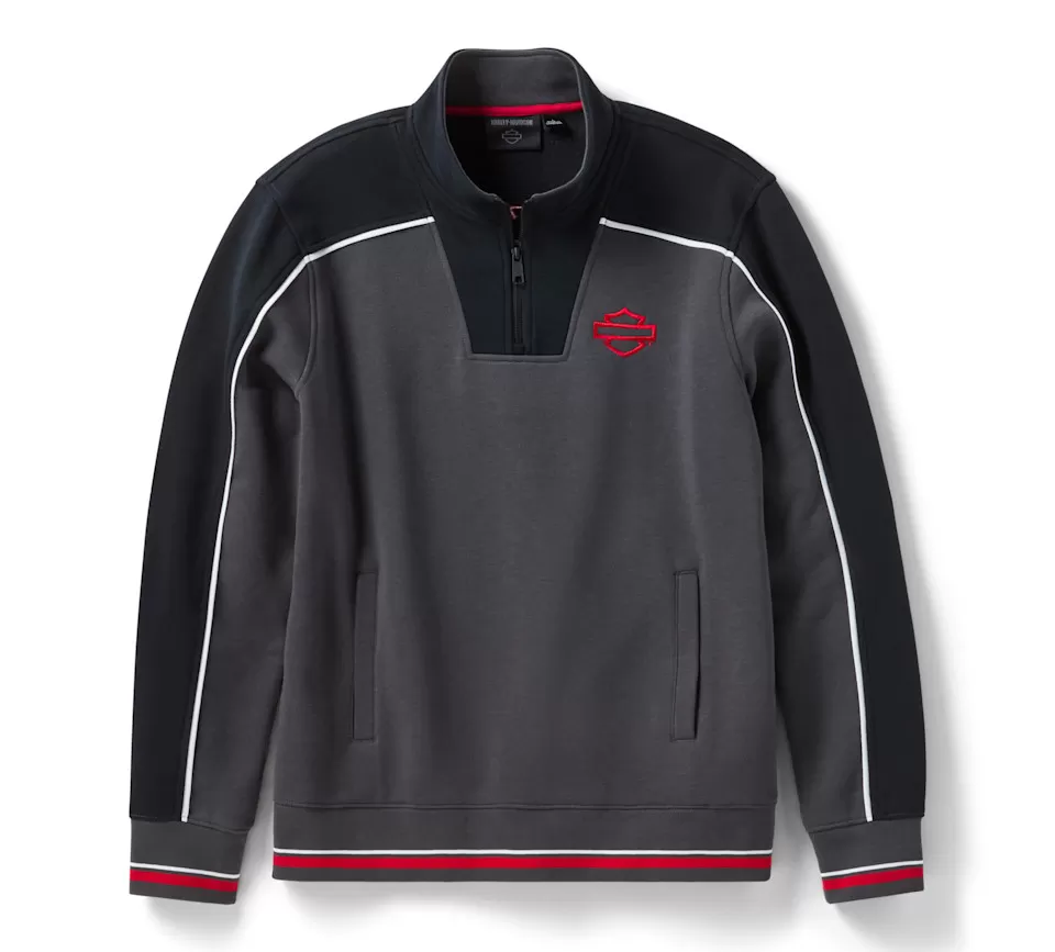 Throw on a layer of bold, race-loving style with our Screamin' Eagle® Color Blocked Hoodie. Made cozy from a brushed cotton/polyester jersey blend with a hit of spandex for added stretch. Its thermal lined hood delivers a textured look (zoon in to see), plus features a double eyelet to tuck away the drawstring so it won’t flap around under your riding gear. This men’s zip hoodie is boldly finished with colorblock styling and graphics that cheer on our winning factory team legacy.