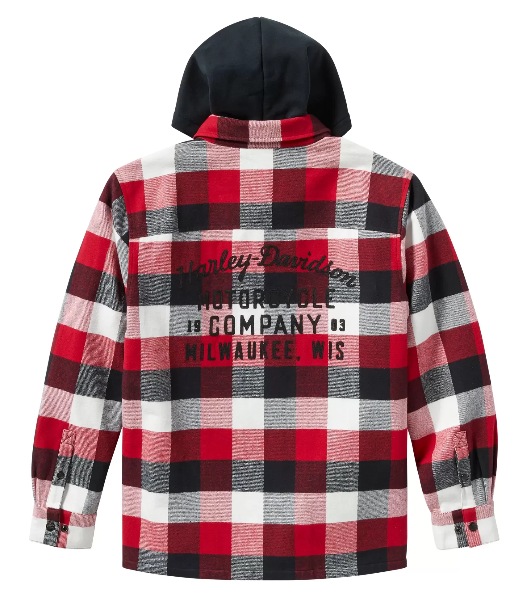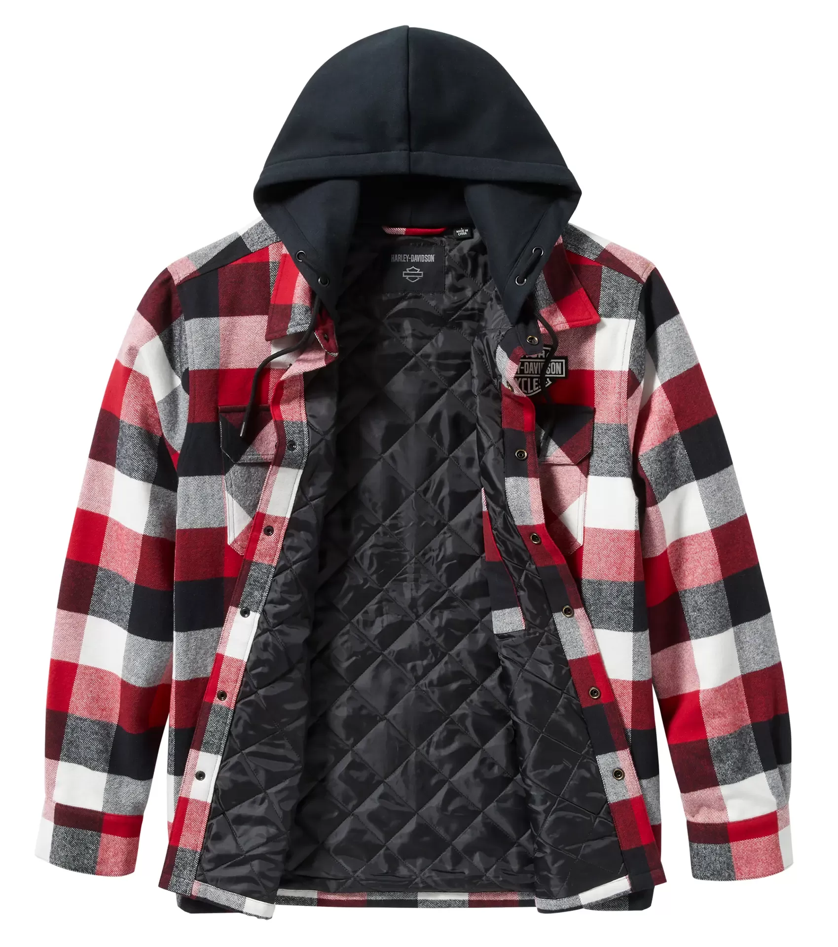 Layer up with the Harley-Davidson Men’s Traveller Hooded Shirt Jacket, model 96807-25VM. Built for comfort, versatility, and classic biker style, this piece delivers the rugged look of a plaid shirt with the added warmth and function of a jacket.