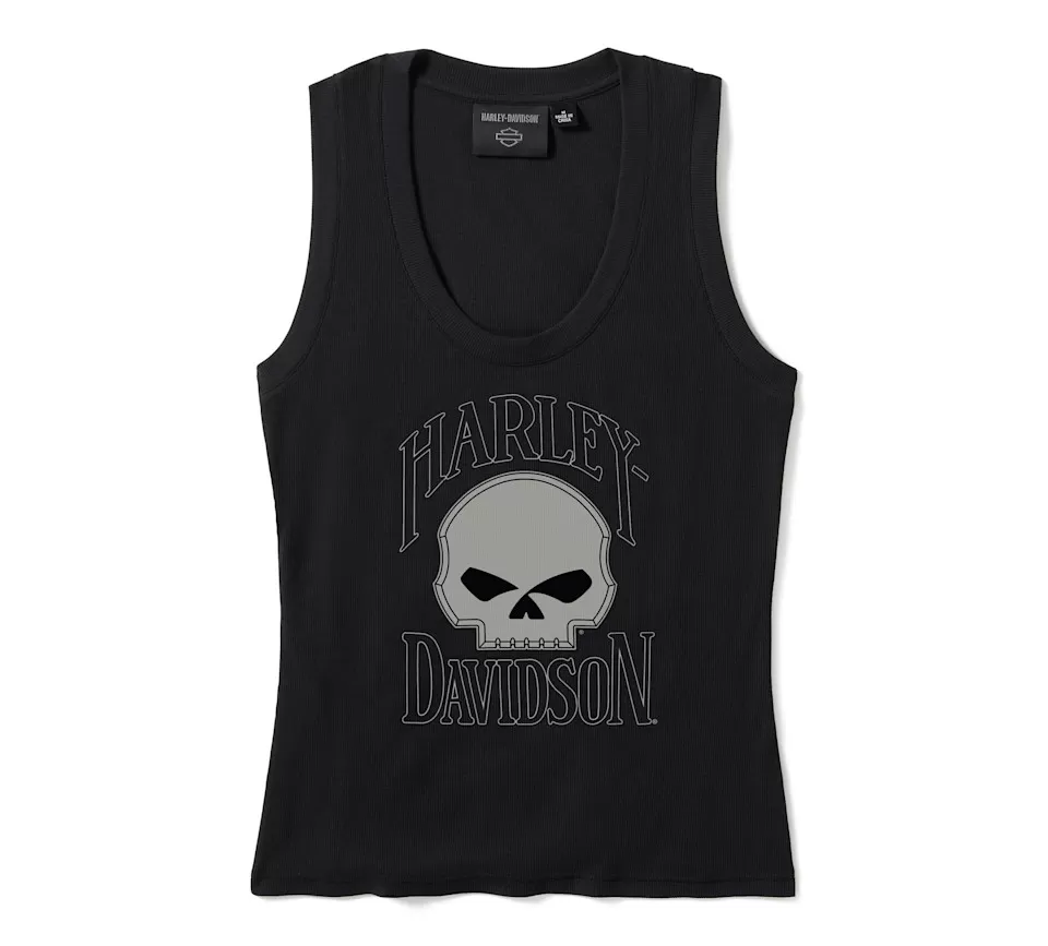 Stay-cool style honors legendary artistry in the Willie G™ Skull Ribbed Tank. Its slim fit is cut from a ribbed cotton/modal blend with a hit of spandex for added stretch. This women’s tank top features a flattering deep scoop-neck and is finished with fearless Willie G Skull graphics. Though the Skull is one of his most popular creations, Willie G. Davidson also designed several motorcycles, including the 1971 FX Super Glide® and the 1977 FXS Low Rider®.