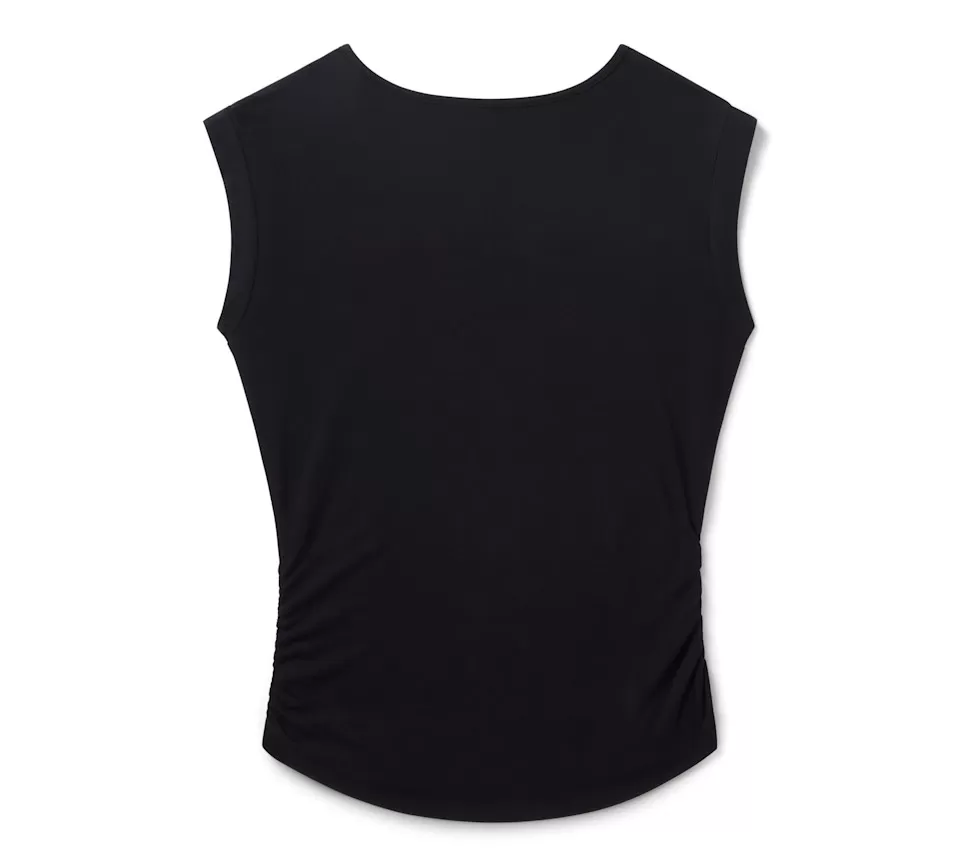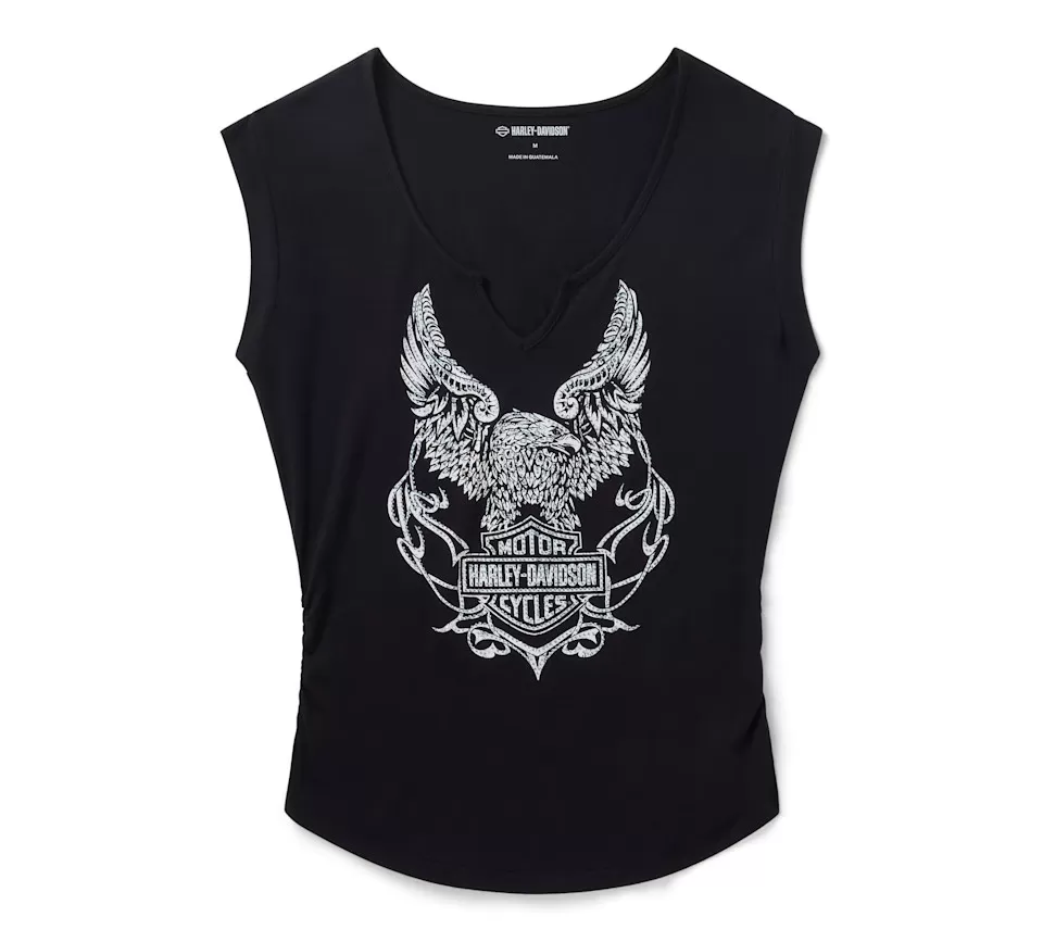 Your moto-loving style soars in our Bling H-D® Born to Fly Notch Neck Muscle Tee. This special issue is built from a 225-gsm rayon jersey for a super soft feel and longwearing comfort with a hit of spandex for added stretch. Designed to flatter your figure, this women’s sleeveless t-shirt features a scooped, notched neckline and side seam ruching. Its exclusive, rhinestone-drenched artwork is inspired by our circa 1976 Bar & Shield eagle design created for the U.S. Bicentennial. Add this to your wardrobe before it’s too late.