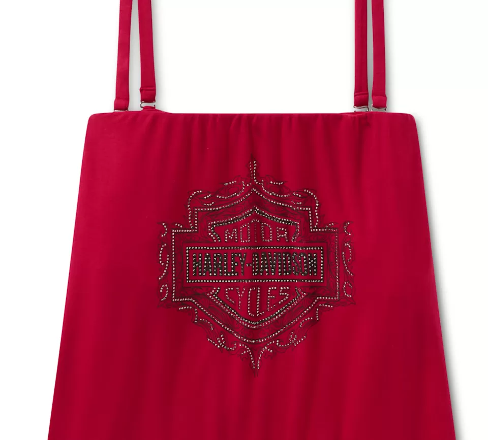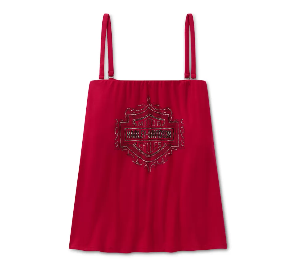 Sexy style with an edge is here on our Bling H-D® Cheers Strapless Tank. This special issue is a perfect pick for holidays and every day in between with its 225-gsm rayon jersey build that has a super soft feel and hit of spandex for added stretch. Its blousy silhouette and interior bra shelf deliver relaxed, longwearing comfort while the removable spaghetti straps give you two flattering looks in one top. Finished with an ornate take on our iconic Bar & Shield that’s meticulously layered in rhinestones. Get yours before they’re gone.