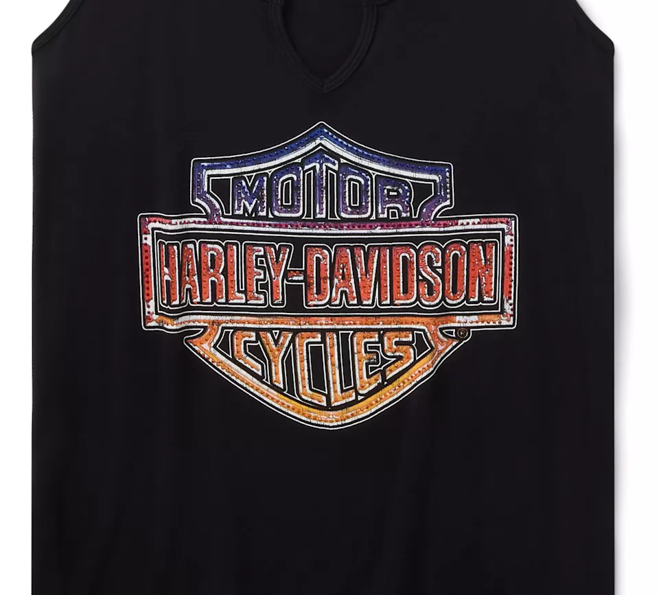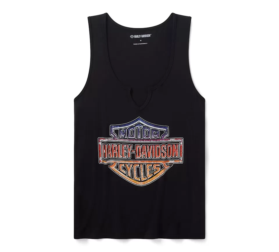 levating your moto look is effortless in our special-edition Bling Ombre Bar & Shield Notch Neck Tank. Made from 225-gsm rayon jersey for a super soft feel and longwearing comfort with a hit of spandex for added stretch. It’s designed with a scooped, notched neckline and showcases our most iconic logo in a distinctive ombre style that’s drenched in rhinestones. Get yours before it’s too late.
