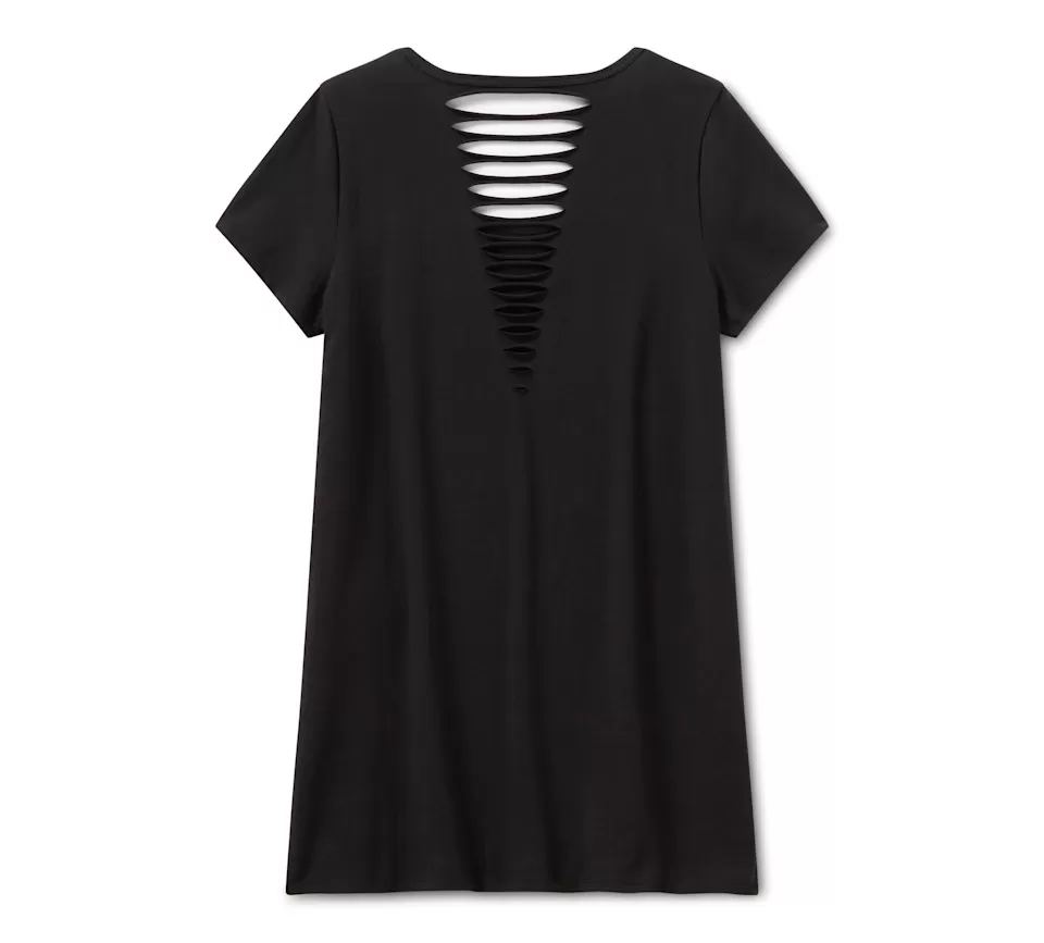 Design Details: Scoop front neckline. Deep back V-neckline with slits. Turnback hem. Tunic length.