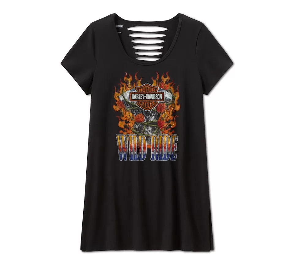 Live-to-ride style is all yours on this special issue. Our Bling Wild Ride Short Sleeve Rip & Repair Tunic is crafted from a sturdy, breathable cut of soft cotton jersey with a hit of spandex for added stretch. It delivers a versatile, flattering fit with details like a scoop front neckline plus a deep rip-and-repair back for an elevated look. Finished with vibrant, rhinestone-kissed artwork on front fuses that power and beauty. Get yours ASAP.