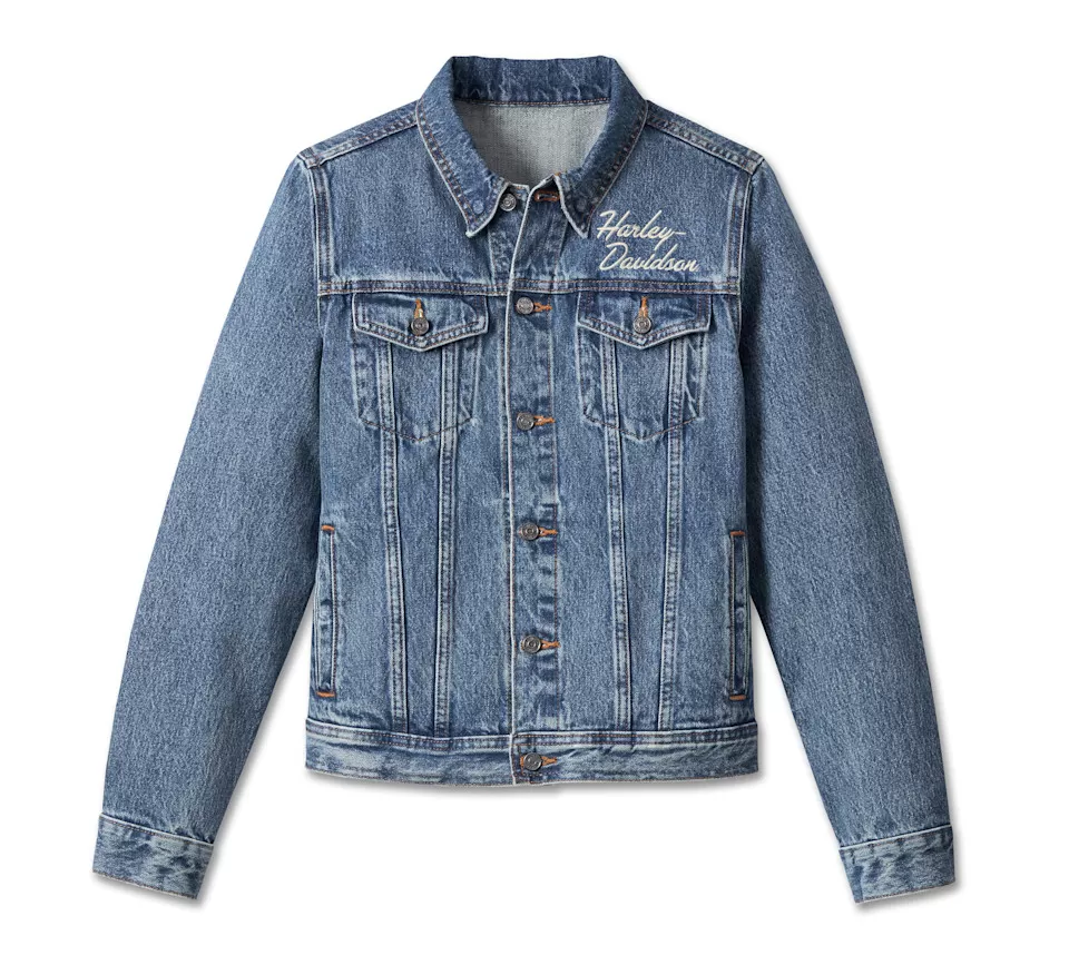 A refreshing take on a time-tested style. Our Essential Bar & Shield Denim Jacket is built from an enduring cut of cotton denim that’s enzyme washed for a softer feel and well-worn look. True to the trucker silhouette, it features branded button closures plus we added a hidden snap-down collar this time around to make it more rider-friendly. Our scripted branding dresses up the front, while a vibrant version of our Bar & Shield owns the back.