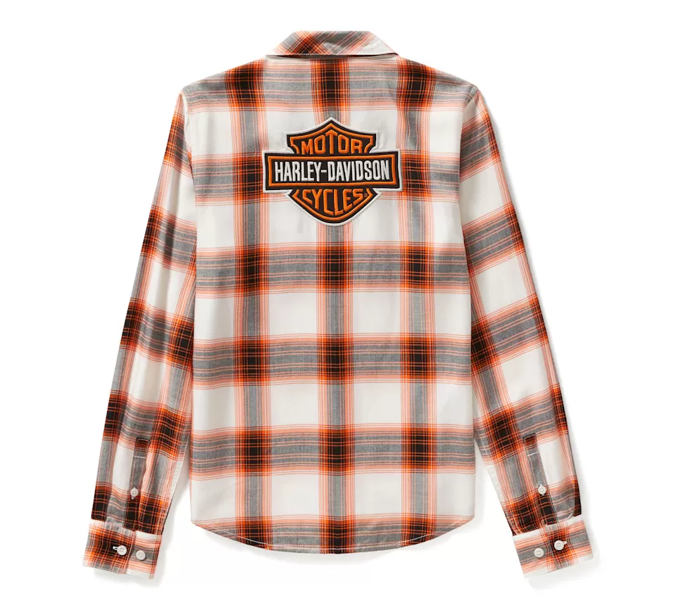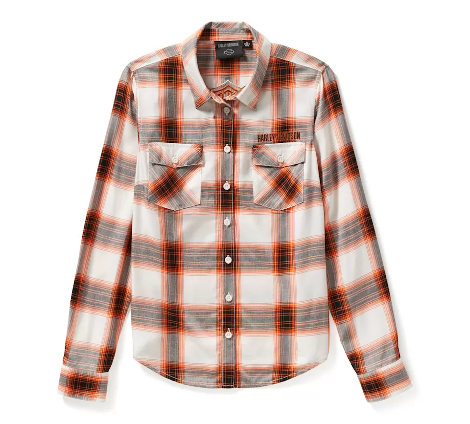 Kee your moto style effortless in our Essential B&S Woven Plaid Long Sleeve. Crafted from viscose twill that’s washed for softness, it’s a wear-all-day pick that feels weightless and drapes beautifully. This long sleeve women’s button down features shape-flattering bust darts and a shirttail hem, plus a hidden snap-down collar that stays put under riding gear. It’s finished with our namesake embroidered on front and an appliqué of our iconic Bar & Shield filling the back.