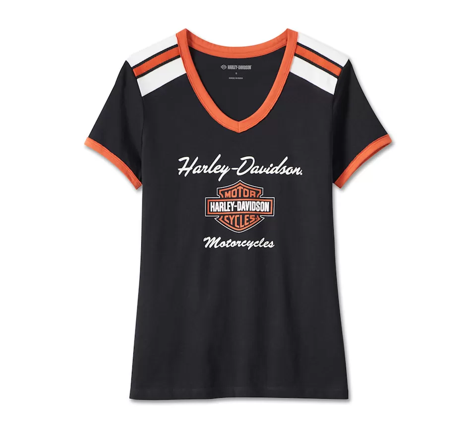 Equal parts enthusiast, sporty, and best-selling. Which is why we’re reintroducing our Iconic V-Neck Shoulder Stripe Tee. Made from all-cotton jersey for all-day comfort with a rib-knit V-neckline to keep its shape. Contrast is the name of the game here with our iconic colors on the binding and shoulder taping. It’s still clean on the back, but we spruced up our contrasting style and bold branding on the front.