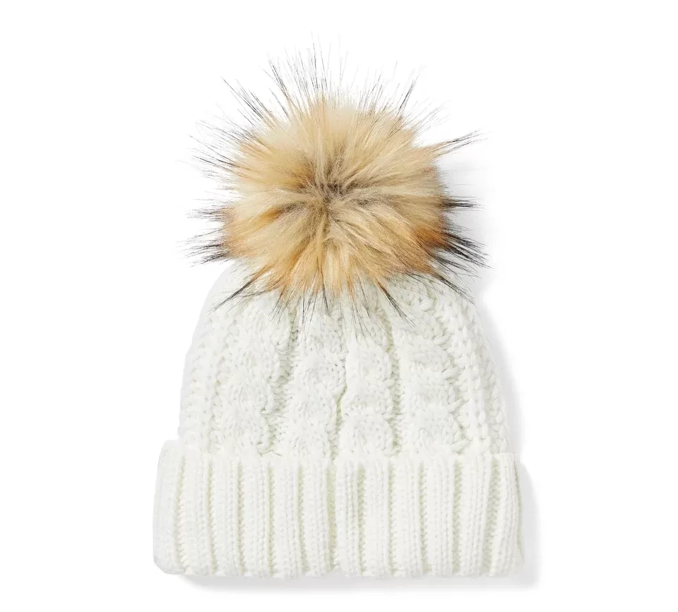 Design Details: Cable knit pattern. Rib-knit folded cuff. Faux fur pom.