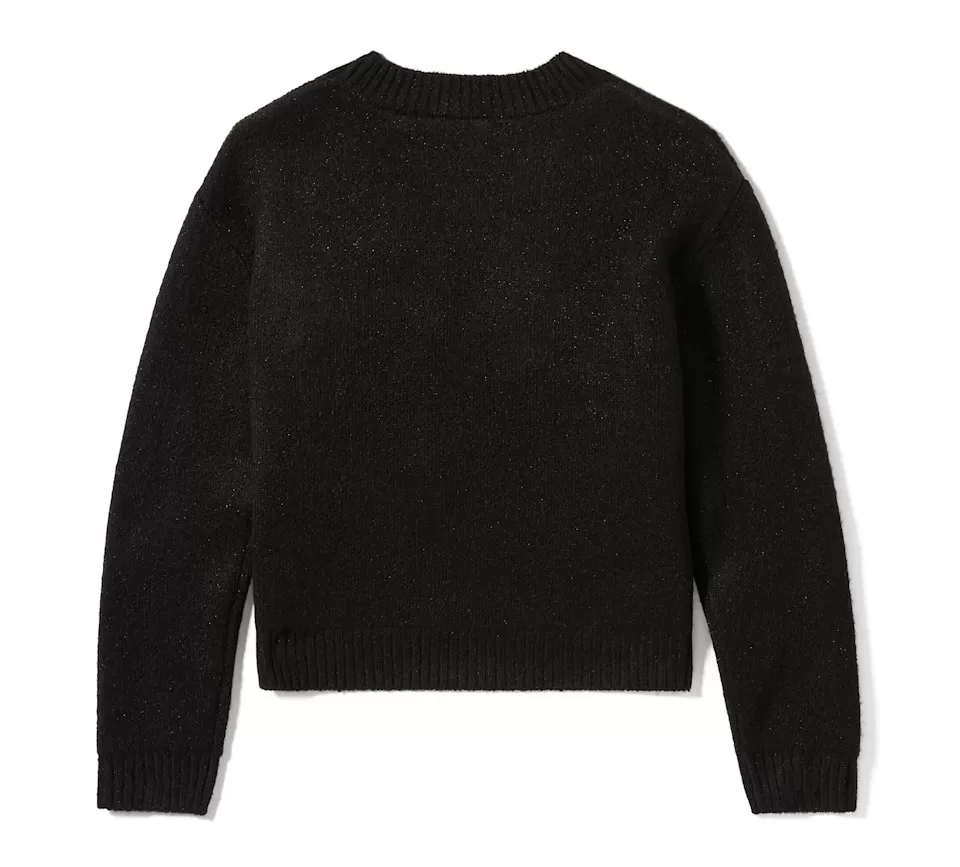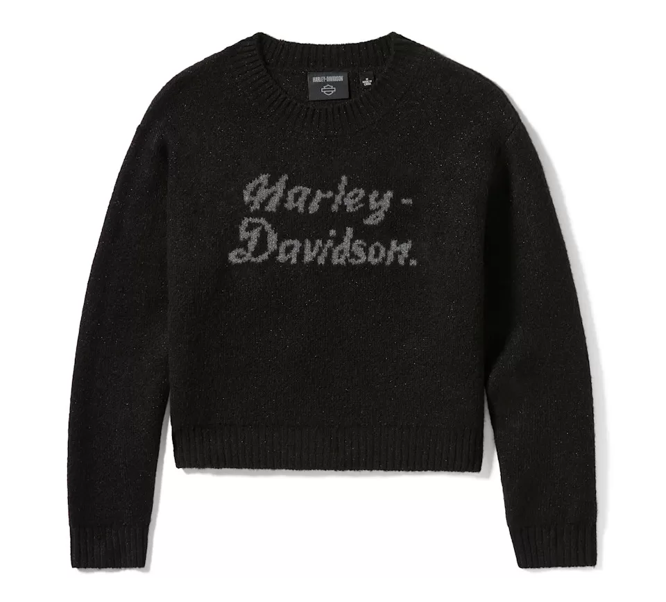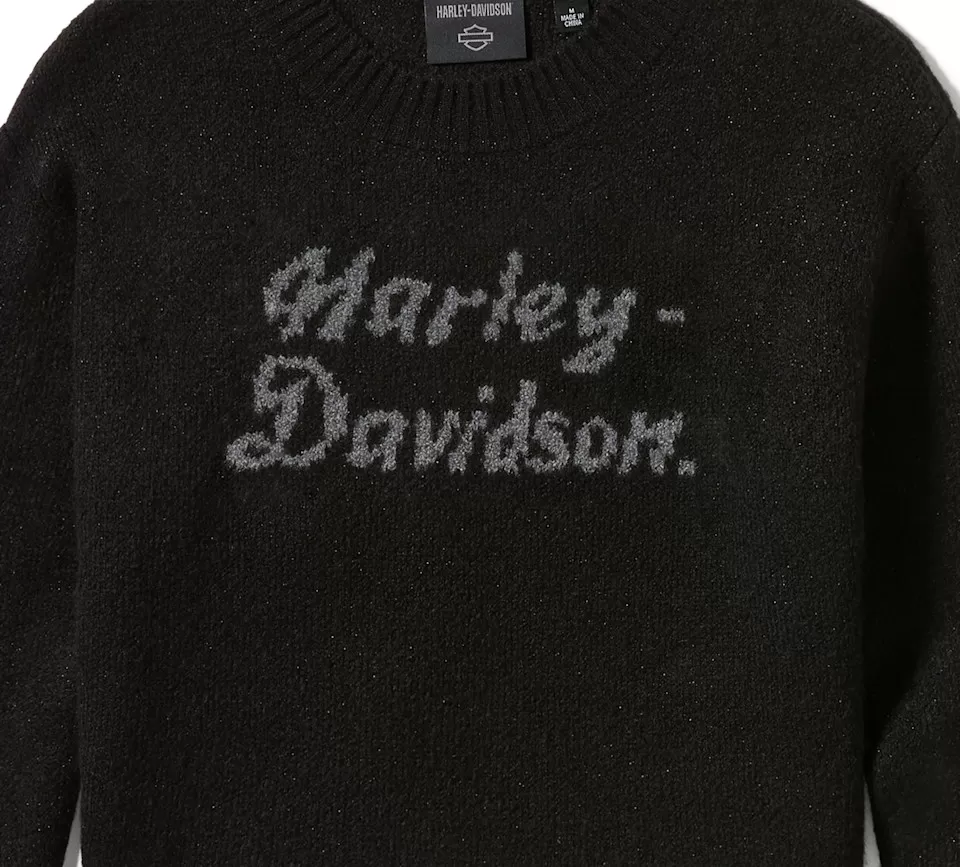 Add some sparkle to your moto style with our limited edition Metallic Script Intarsia Sweater. Knit from an acrylic-based yarn blend with a hit of spandex for added stretch, it delivers warmth without the itch of wool. This women’s crewneck sweater stylishly features drop shoulders, slight blouson sleeves, and a curved hem. Metallic knit graphics fill the front and are peppered throughout for a shimmering look (zoom in to see). Snag yours while supplies last.