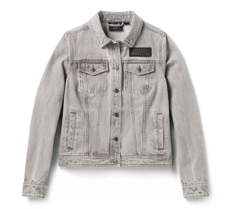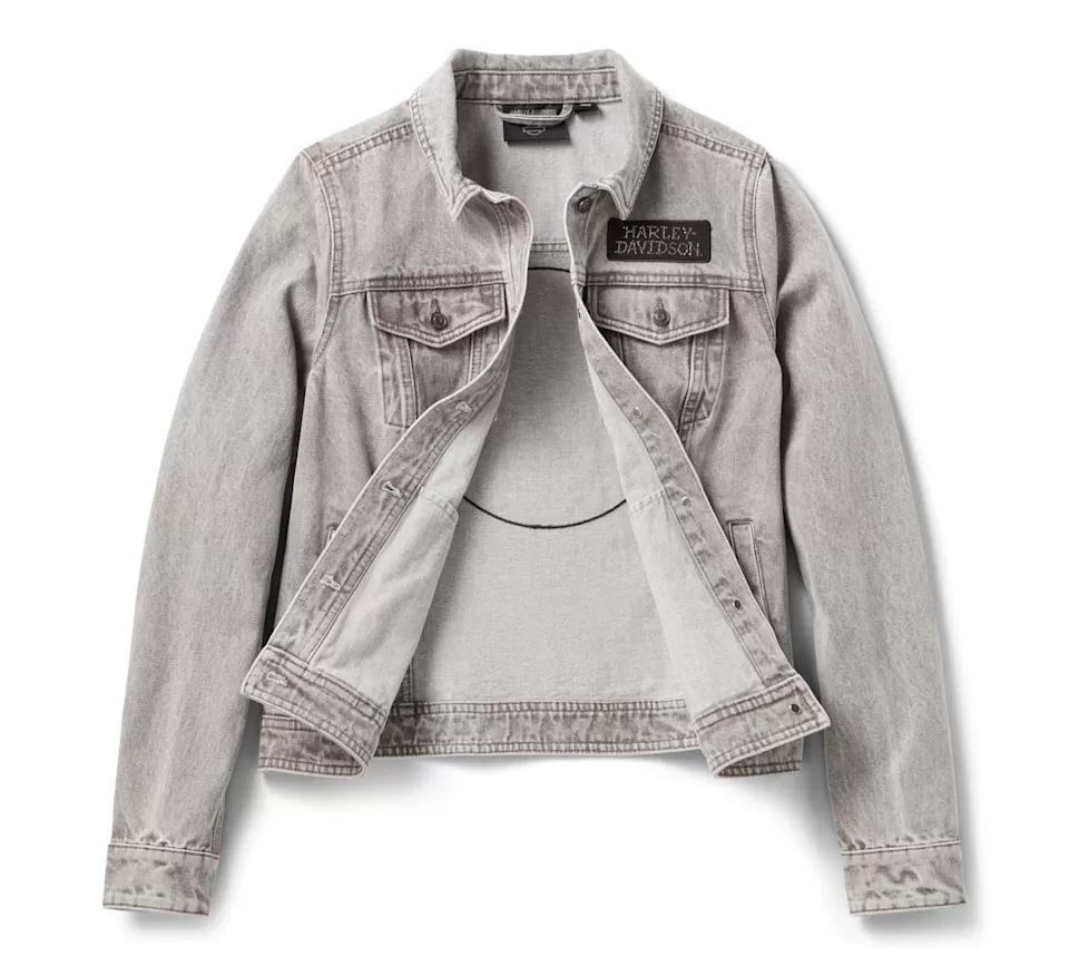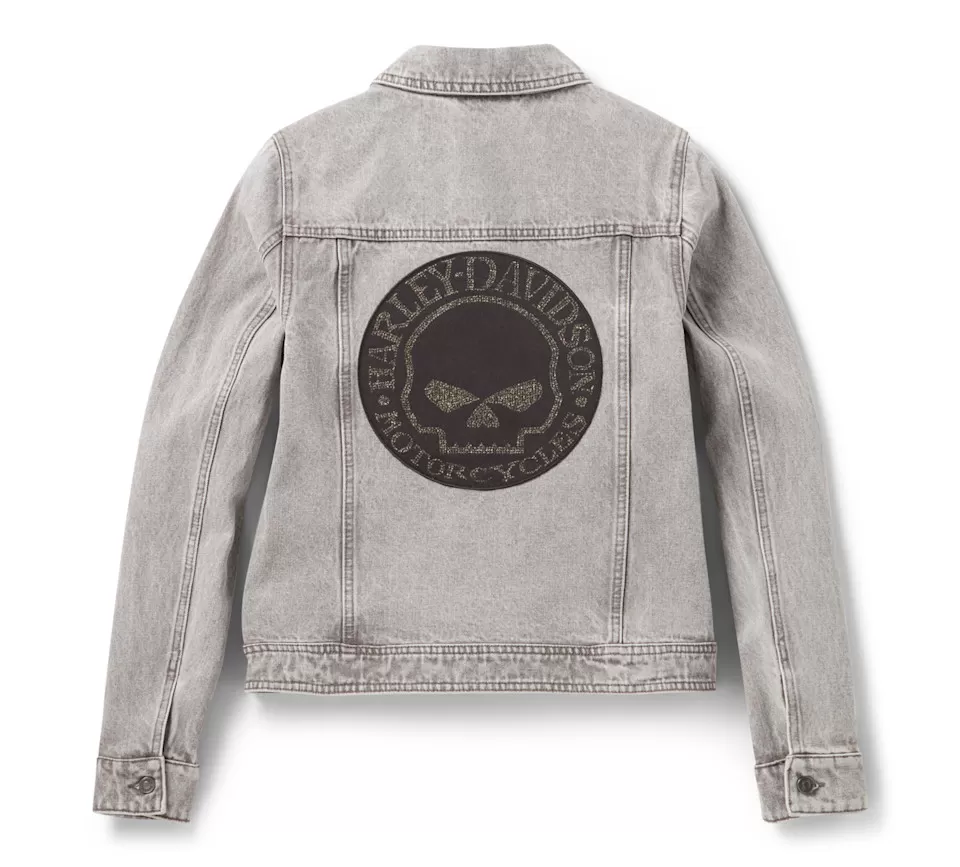 Glistening nostalgic style is all yours in the Willie G™ Bling Denim Jacket. Built from cotton denim that’s bleach washed for a throwback look from the late 1980s and early 1990s. Its classic trucker silhouette features a locker loop for easy hanging, and hidden snap-down collar that stays put under riding gear. What makes this women’s denim jacket a true statement piece are the gorgeous rhinestone-adorned appliqués that grace the front and go all-in on back. Though the Skull showcased here is one of Willie G. Davidson’s most popular creations, he also designed several motorcycles, including the 1971 FX Super Glide® model and the 1977 FXS Low Rider® model.