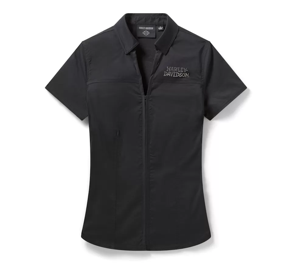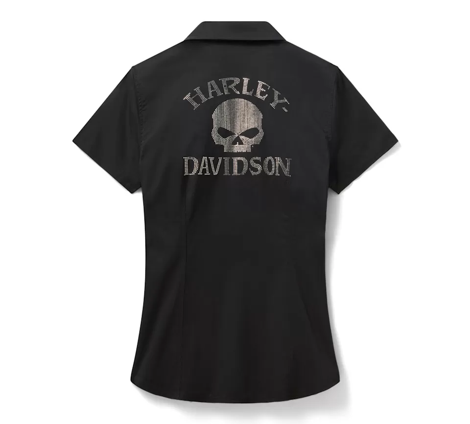 Shape-flattering style gets a glimmering kiss on the Willie G™ Bling Garage Shirt. Its fitted silhouette is crafted from a rugged twill blend that’s peached for softness with a hit of spandex for move-with-you stretch. This women’s zip front short sleeve shirt features a deep V-neckline, bust darts, and princess seams, plus a hidden snap-down collar that stays put under your riding gear. Finished with stunning rhinestone graphics on both sides. Know the history—though the Skull spotlighted here on back is one of his most popular creations, Willie G. Davidson also designed several motorcycles, including the 1971 FX Super Glide® model and the 1977 FXS Low Rider® model.