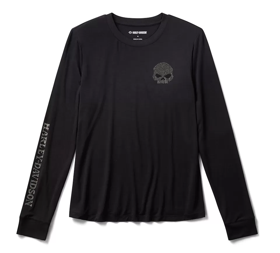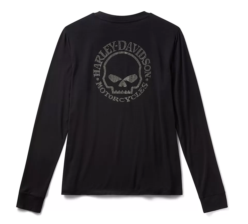 Your casual look gets a shimmering moto upgrade in the Willie G™ Skull Bling Long Sleeve. This women’s top is crafted for longwearing comfort from super soft rayon jersey with a hit of spandex for added stretch. It features rib-knit trim to help keep its shape, plus stunning rhinestone graphics on both sides and riding down one sleeve. Know the history—though the Skull spotlighted here is one of his most popular creations, Willie G. Davidson also designed several motorcycles, including the 1971 FX Super Glide® model and the 1977 FXS Low Rider® model.