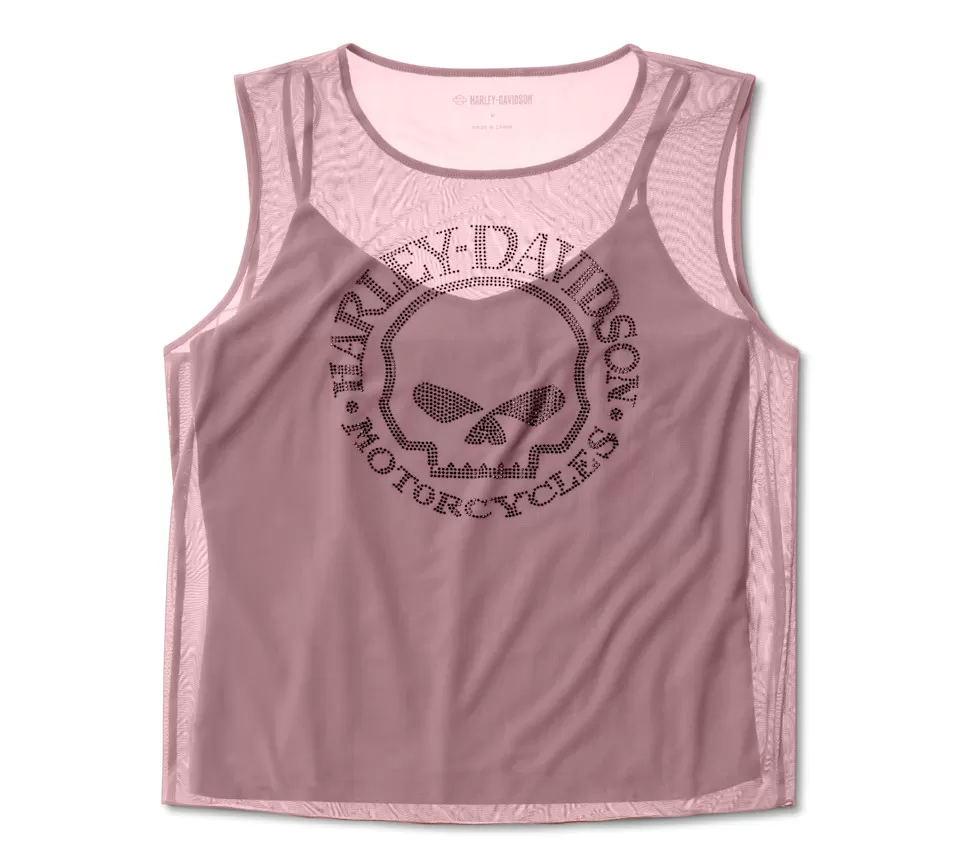 Sheer layering style gets a glistening touch in our Willie G™ Skull Bling Mesh Top. Its mesh outer layer and removable jersey inner camisole are cut in a shorter length for a shape-flattering silhouette. They create a seamless elevated look together, or can be worn separately with other options in your wardrobe. The mesh layer features stunning rhinestone graphics spotlighting the iconic Willie G Skull. Know the history—though the Skull is one of his most popular creations, Willie G. Davidson also designed several motorcycles, including the 1971 FX Super Glide® model and the 1977 FXS Low Rider® model.
